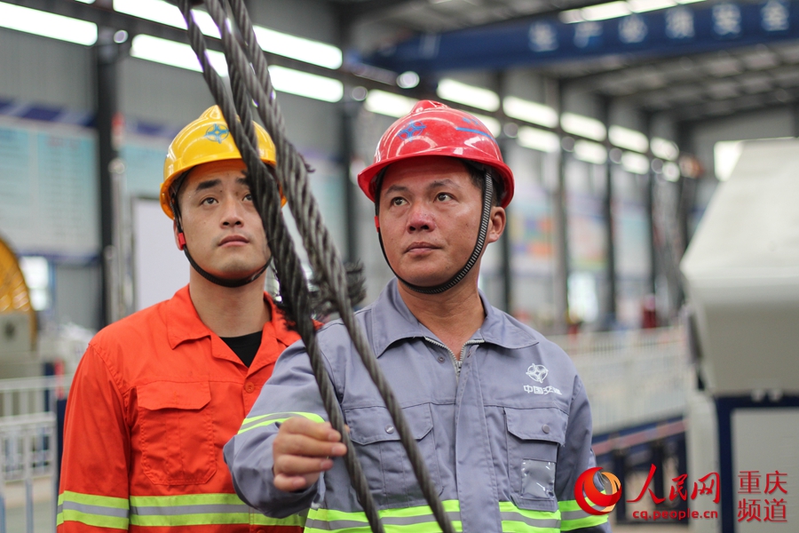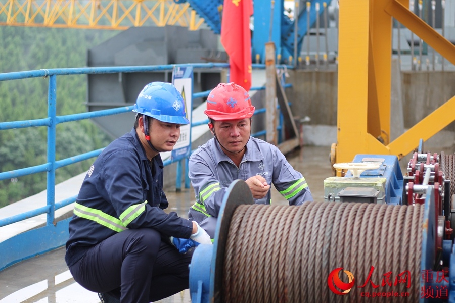拆裝橫向支撐設(shè)備前,李廣輝與工友一同檢查卷?yè)P(yáng)機(jī)的安全性能。中交一公局 供圖